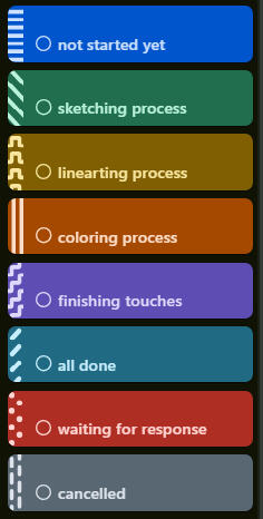 Deadline can be set by commissioner at prior notify. Any late mention of deadline will not be considered my, the artist's, responsibility.